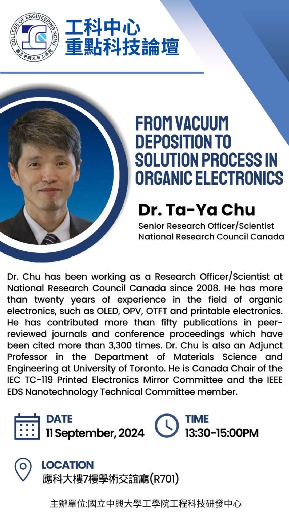 《工科中心重點科技論壇》From Vacuum Deposition to Solution Process in Organic Electronics