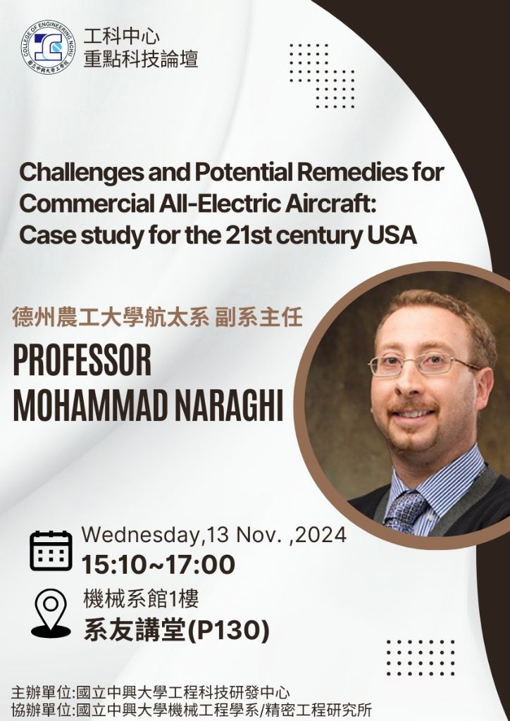 《工科中心重點科技論壇》Challenges and Potential Remedies for Commercial All-Electric Aircraft: Case study for the 21st century USA