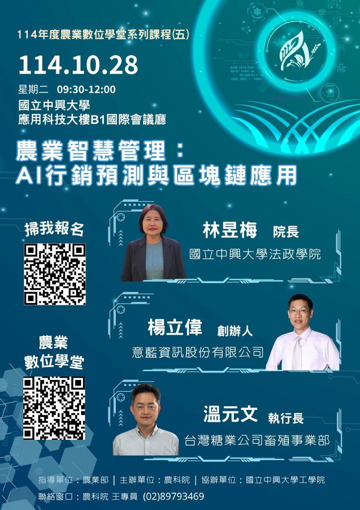 《114年農業數位學堂系列課程(五)~農業智慧管理:AI 行銷預測與區塊鏈應用》