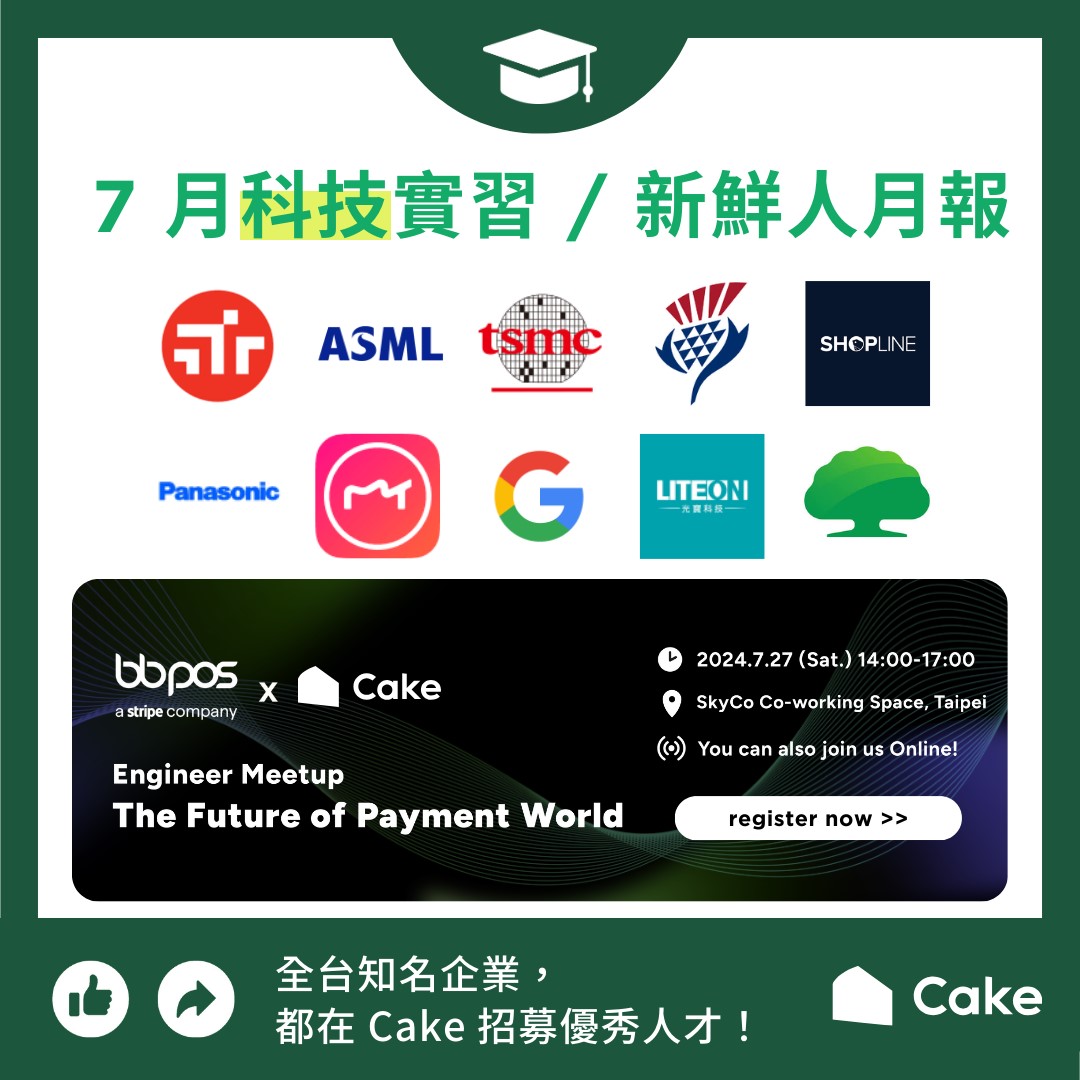 本月的月報為你帶來 Google、ASML、國泰世華 等公司的工作機會! 歡迎所有 應屆畢業生 與 新鮮人 來參考職缺,時下最熱門的 AI 相關工作也有! 【 跨國工程團隊工作機會|Engineer Meetup : The Future of Payment World 】 全球頂尖 FinTech 獨角獸 Stripe 團隊在台公開招募, 歡迎優秀的軟體、韌體與硬體工程師報名 BBPOS, a Stripe Company 的首場在台招募說明會! 立即免費報名>> 【Cake 2024 AI 工作全攻略 完整 AI 職缺資訊】 你也想一起加入 AI 產業的先鋒隊伍嗎?該怎麼找 AI 工作機會、躋身高薪 AI 產業? 來看一下 Cake 幫你貼心整理的「2024 AI 工作全攻略」,包含:「AI 工作熱潮的秘密情報」、「新世代的熱門 AI 工作一覽」、 「Cake 精選 AI 職缺企業」,讓你馬上掌握 AI 職缺情報,應徵你夢寐以求的 AI 工作! 立即查看:
